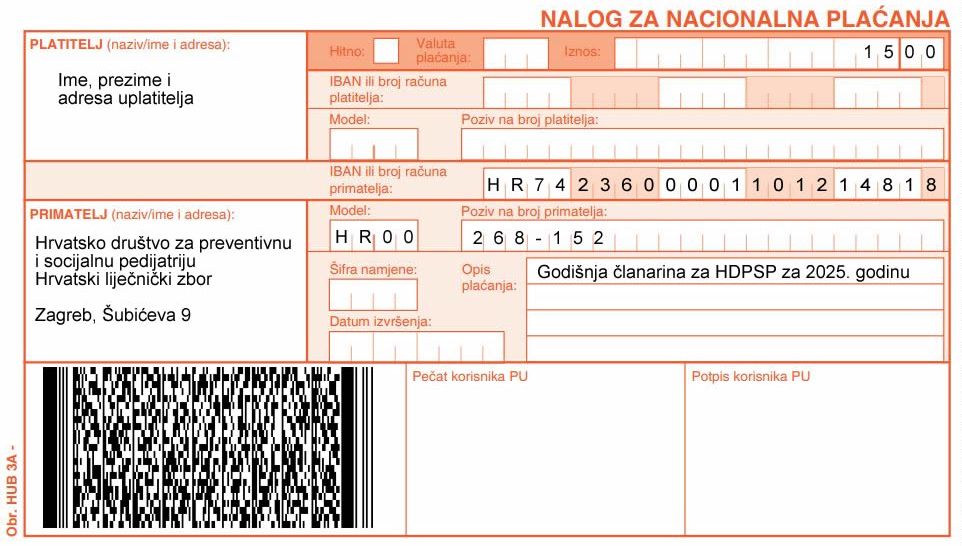 Godišnja članarina Hrvatskog društva za preventivnu i socijalnu pedijatriju iznosi 15 € po osobi. Uplaćuje se na žiro-račun HLZ i poziv na broj HDPSP.